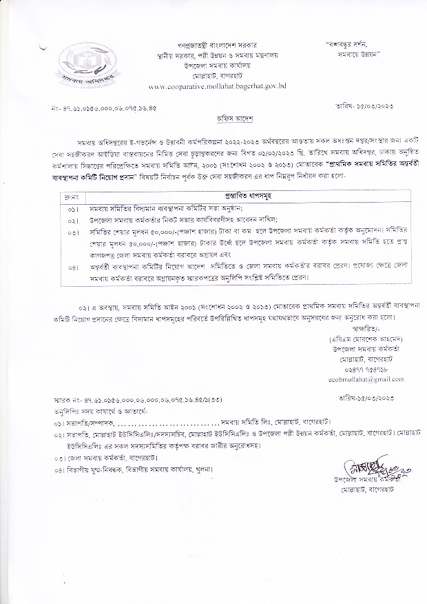প্রাথমিক সমবায় সমিতির অন্তর্বর্তী ব্যবস্থাপনা কমিটি নিয়োগ প্রদান সংক্রান্ত অফিস আদেশ।